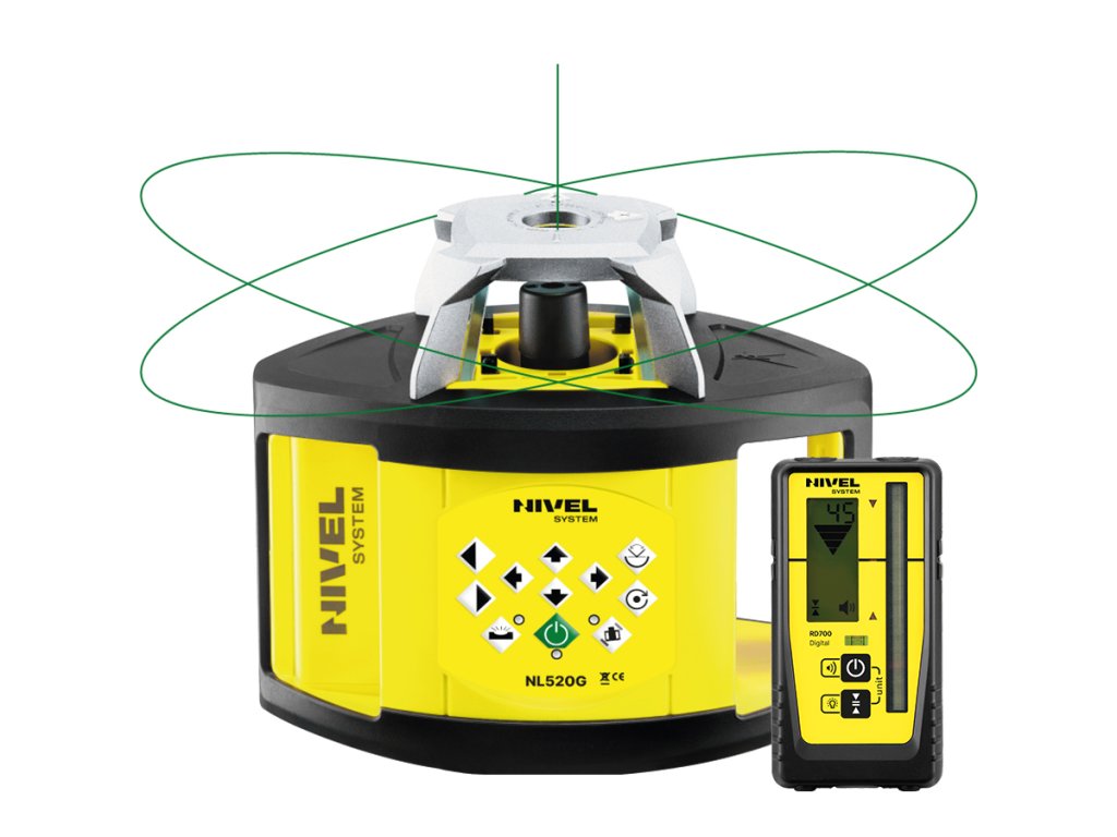 Rotační laser Nivel System NL520G je všestranný a multifunkční nástroj pro provádění prací jak v interiéru (s velmi viditelným zeleným laserovým paprskem je zelený paprsek čtyřikrát viditelnější než klasický červený), tak v otevřených prostorách (pomocí senzoru) . Přístroj určí vodorovnou, nakloněnou a svislou rovinu (po otočení o 90°) a díky olovnici i svislý nebo pravý úhel. NL520G je určen pro běžné stavební práce. Jeho předností je životnost a odolnost vůči povětrnostním vlivům a účinné lithium-iontové baterie zajišťující několik desítek hodin nepřetržitého provozu v terénu. Zařízení je uživatelsky přívětivé díky intuitivnímu rozhraní a možnosti dálkového ovládání pomocí dálkového ovladače.